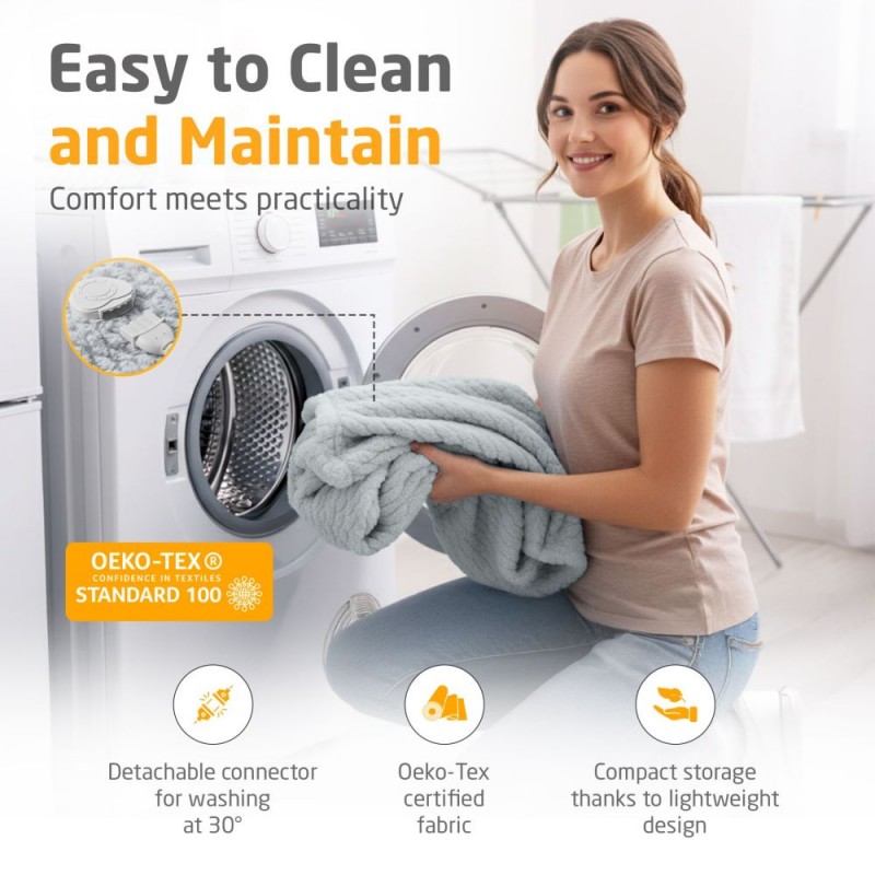 Šildoma antklodė yra pagaminta iš aukštos kokybės poliesterio ir pasižymi aksominiu, minkštu paviršiumi, suteikiančiu unikalų jaukumo pojūtį. Nuimamas valdymo pultelis leidžia skalbti antklodę 30 °C temperatūroje. Prietaisas yra sertifikuotas pagal Oeko-Tex Standard 100 ir prieinamas keturiomis madingomis spalvomis – mėlyna, pilka, žalia ir violetinė, todėl dera prie bet kokio interjero.
