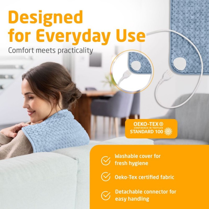 Automatinis išsijungimas po 90 minučių užtikrina saugų šildymo pagalvėlės naudojimą. Integruota apsauga nuo perkaitimo suteikia papildomą saugumą. Šildymo pagalvėlė užtikrina saugų ir komfortišką šildymą, o Oeko-Tex Standard 100 sertifikatas patvirtina medžiagų patikimumą.