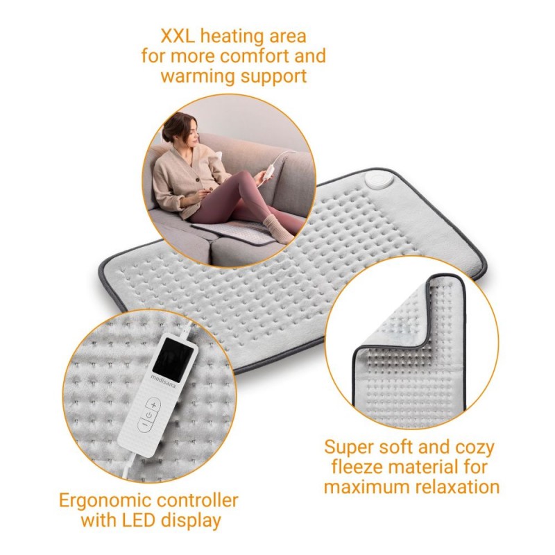 Dėl savo įspūdingo dydžio – apie 60 × 35 cm – Medisana HP 700 XXL puikiai tinka nugaros šildymui. Šiluma pasiskirsto tolygiai ir jaučiama labai greitai – priklausomai nuo pasirinkto lygio, vos per 2–4 minutes. Ši šildymo pagalvėlė idealiai tinka didesniems kūno plotams - puikiai tinka raumenų įtampai malšinti ar šildyti šalčiui jautrias vietas.